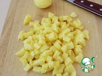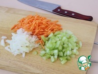 Сельдерей, морковь и лук нарезать небольшими кубиками. |