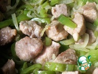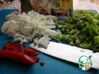 Мясо нарезать средними кубиками. Лук и перец нарезать средней соломкой. |