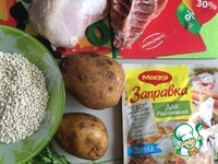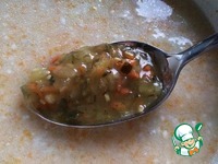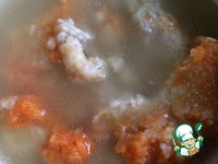 Мясо курицы, перловку, картофель, сельдерей и морковь я пропустила через мясорубку и залила куриным бульоном. |