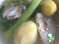 Курицу варить до готовности. Добавить в бульон стебель сельдерея, морковь, луковицу. Там же я отварила картофель. |