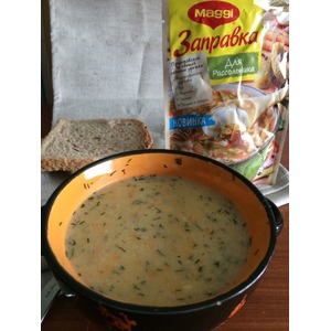 Довести до кипения и в самом конце добавить 1 упаковку заправки Магги для рассольника. |