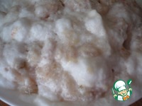 Осторожно, перемешать белки с фаршем. Важно чтобы фарш оставался воздушным, по консистенции он напоминает очень воздушную сметану. |