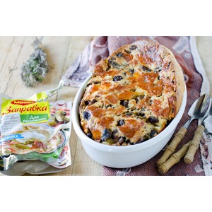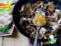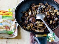 В сковороде растопить сливочное масло и обжарить грибы в течении 10 минут. Затем добавить заправку Магги для рассольника с маринованными огурчиками, тимьян и перец. |