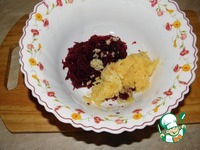 Свеклу отварить до готовности, дать остыть, натереть на мелкой терке, яблоко очистить, тоже натереть в пюре на мелкой терке, чеснок пропустить через пресс |