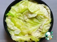 Форму (у меня диаметром 28 см) смазываем маслом, посыпаем сухарями, а затем дно и бортики выкладываем капустными листами таким образом, чтобы края листов немного выходили за пределы формы. |