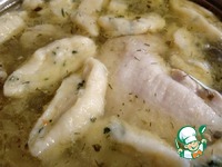 При подаче в тарелку положить курицу и галушки, залить бульоном и посыпать зеленью. |