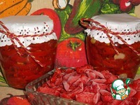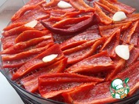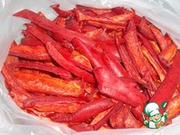 На дольки перцев выкладываем несколько пластинок чеснока в произвольном порядке, в средину поддона помещаем горький перец, совсем слегка присыпаем приправой, сушим около 7,5 часов (зависит от перца)… |
