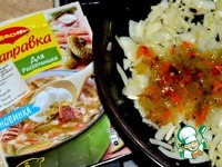 В сковороде разогреваем растительное масло с 1 ст. л. сливочного и обжариваем лук в течение 5 минут, но не даем ему зажариваться. Добавляем приправу и готовим еще 1 минуту. |