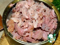 Тунец слегка разминаем вилкой, если жидкости в нем слишком много то часть сливаем. |