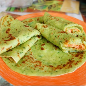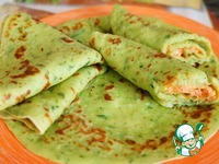 Всегда любила сырные блины. Шпинат дает сочный цвет, чеснок не чувствуется, но придает пикантность.