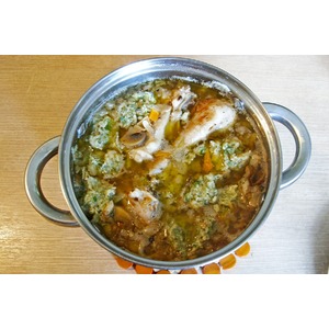 Описание: Старое, доброе домашнее куриное рагу с лёгкими сытными клёцками, таящими в себе аромат свежих трав. Рагу готовится из "окорочков", мясо которых сохраняет сочность и яркий вкус даже после отваривания. Лук и морковь составляют основу соуса, а шампиньоны добавляют контрастный изыск к глубокому, пусть и слегка грубоватому вкусу рагу.