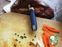 Лук, сельдерей и оставшуюся морковь крупно порубить и уложить на дно утятницы. Чуть присолить и положить черный перец горошком. |