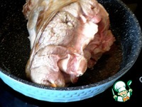Уложить ногу и влить вино, смешанное с кипятком. Воды взять столько, чтобы дно было покрыто сантиметра на три. |
