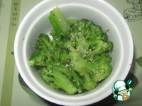 Соцветия брокколи, если замороженные, как у меня, то размораживаем (я это сделала в СВЧ). Если капуста свежая, то соцветия нужно опустить в кипящую воду и подержать там буквально 3 минуты. |