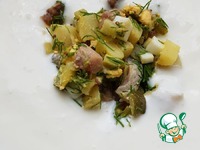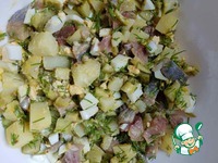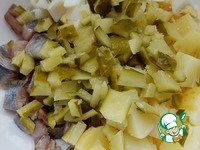 Нарезаем сельдь, картофель, яйцо и маринованный огурец. |