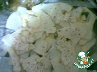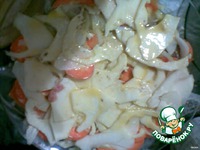 Pыбу помыть, порезать на кусочки и промариновать в соевом соусе с чесноком и майонезом. Патиссоны, очищенные от кожицы и семя, н порезать тонко. |