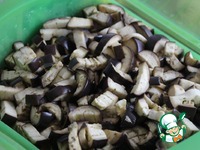 У баклажанов отрезать хвостики, порезать брусочками и поставить в микро на 5 мин - у меня мощность 900ВТ. Отжать от воды. |