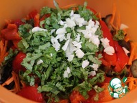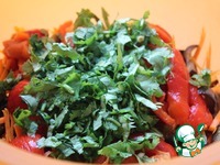 Морковку, нарезанные перцы, половину нарезанной зелени добавляем к баклажанам. |