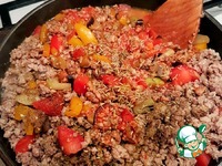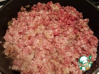 К обжаренному луку добавляем фарш и на максимальном огне жарим-тушим до полуготовности. Снимаем с огня. |