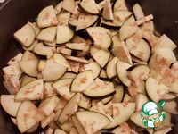 Кабачок я почистила, так как мне он показался уж слишком толстокожим. Прошло как раз минуты 4-5 как мы отправили тушиться баклажан. Добавляем кабачок. |