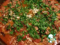 Добавляем наш фарш со всеми его соками, томатную пасту, травы, солим и перчим по вкусу, закрываем крышкой и тушим на небольшом огне около 15-20 минут. |