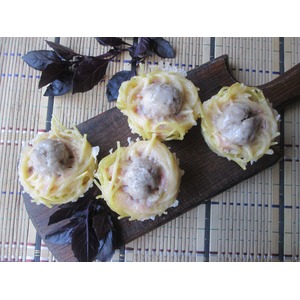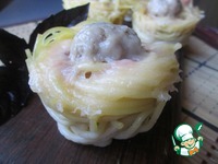 В формы для маффинов выложите спагетти, формируя " гнездо ". В " гнездо "положите по столовой ложке томатного соуса. |