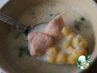 Описание: Нежный, сливочный, очень вкусный суп! Кукуруза хорошо сочетается с красной рыбой, а сливки подчеркивают вкус того и другого. Непременно попробуйте!