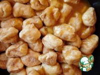 Смешиваем сахар и корицу. Тесто раскатываем в жгут, см. 2 в диаметре и нарезаем некрупными кусочками. Обваливаем каждый кусочек в корично-сахарной смеси и выкладываем в форму. |