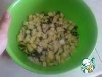 Нарезаем баклажан кубиками, солим и замачиваем в воде минут на 30, для того чтобы избавиться от горечи. Тем временем остальные овощи и мясо так же режем кубиками. |