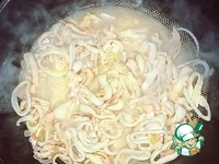 Чистим лук, режим колечками, мелко нарезаем чеснок и жарим |