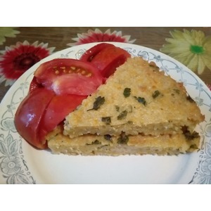 К рису с овощами добавить измельчённую зелень, влить яйца и все хорошо перемешать. Выложить в форму, смазанную растительным маслом. Немножко утрамбовать. Выпекать в разогретой до 180 градусов духовке 30-40 минут до чуть золотистого цвета.