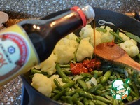Добавить чесночно - перечную пасту, степень остроты регулируйте по вкусу, влить соевый соус "ВОК" от Киккоман. Огонь включить на максимум, жарить пару минут при интенсивном перемешивании. |