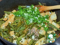 Добавить рубленую зелень и молотый кориандр. Перемешать. Огонь выключить. Приправить кунжутом. |