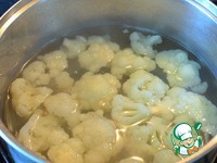 В это время цветную капусту разобрать на соцветия, отварить в подсоленной воде, 4 минуты. Откинуть на сито и промыть холодной водой. |