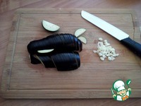 Чеснок мелко рубим, баклажан режем полу-пластинами тонко. |