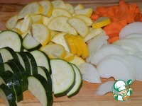 Кабачки, морковь, лук и чеснок нарезать полукольцами. |