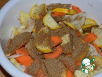 Сложить нарезанные овощи в глубокую миску, посыпать приправой для моркови по-корейски и перемешать. |