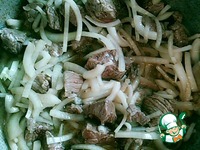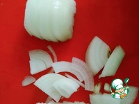Пока мясо пустит сок, нарезаем лук полукольцами и еще пополам |