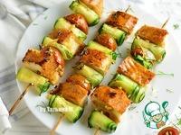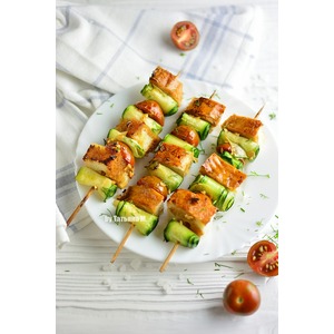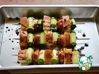 Хлеб порезать кубиками, нанизать на шпажки хлеб, чередуя с черри и кабачком, свернутым рулетиками; |