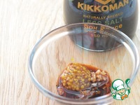 Тем временем приготовьте заправку. Зубчик чеснока измельчите, смешайте с соевым соусом "Киккоман" и горчицей |