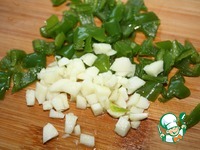 Мелко порезать чили и чеснок. Лук нарезать полукольцами. |