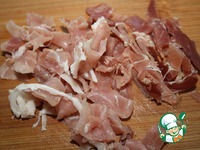Бекон мелко нарезать. Бекона нужно совсем немного, лишь бы он дал ароматную нотку копчености. |