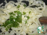 Раскалить масло и добавить лук, чеснок и перец. Обжариваем около 5 минут на большом огне, постоянно помешивая. |