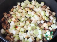 Добавляем кабачок, соус Терияке Киккоман, солим перчим. Готовим 3-4 минуты до готовности кабачка. Начинка готова. |