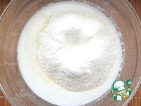 Для теста, в кефир добавляем растительное масло, соль, соду, просеянную муку. |