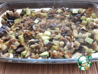 В небольшом количестве растительного масла обжариваем лук до золотистого цвета. Добавляем баклажан. Готовим периодически помешивая минут 10-12. |