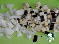 Если у баклажана кожица грубая, срезать ее. Баклажан и лук нарезать кубиком. |