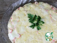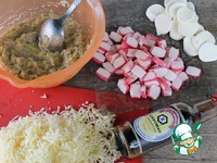 В готовую луково-кабачковую смесь добавить сметану. Крабовые палочки нарезать, моцареллу тоже. Твердый сыр натереть на мелкой терке. |