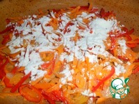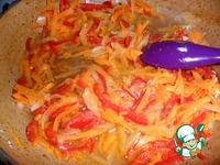 Разогреть сковороду с маслом и протушить овощи: сначала лук до прозрачности, а потом добавить морковь и перец, все вместе тушить на небольшом огне пару минут. |