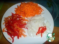 Нарезать овощи: лук -полукольцами, болгарский перец -соломкой, морковь натереть на терке, нарезать горький перец - острота по вкусу. |